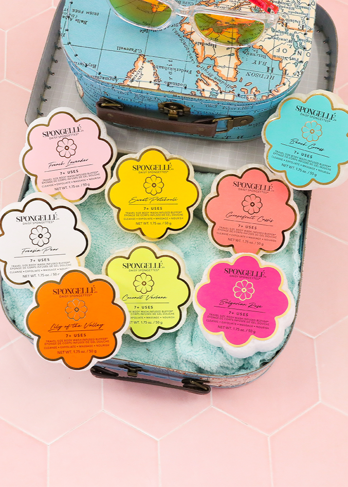8 Fragrances. Everything you love about Spongellé® in a convenient travel-size Spongette meets Daisy Collection’s signature flower design infused with more washes. Accepted on all airlines, leak-proof, easy to carry, and everything you need for soft and radiant skin. Enjoy our assortment of eight travel-friendly blends in Bulgarian Rose, Beach Grass, Coconut Verbena, French Lavender, Freesia Pear, Grapefruit Cassis, Lily of the Valley, and Sweet Patchouli to spruce up any vacation or trip to the gym. Good for 7+ washes per buffer. Transform bath time into a luxurious retreat with our indulgent bath sponges, making them the perfect addition to spas, gift shops, and apparel boutiques alike. These plush and invigorating body care tools add a touch of opulence to any self-care routine, creating a spa-like experience in the comfort of one's home. Ideal for inclusion in body care gift sets or as standalone wellness gifts. Gift Sets