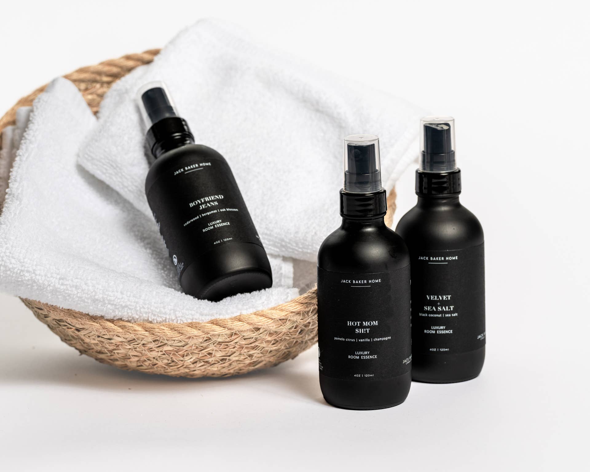 Jack Baker room sprays are handcrafted in small batches to ensure the highest quality and attention to detail. Packaged in a sleek sophisticated 4 oz black glass bottle or a refined white glass bottle with a timeless golden top, each spray adds a touch of elegance to your space while filling it with an exquisite, long-lasting fragrance. Perfect for refreshing any room, linens, or office, it's a luxurious essential for any home.
