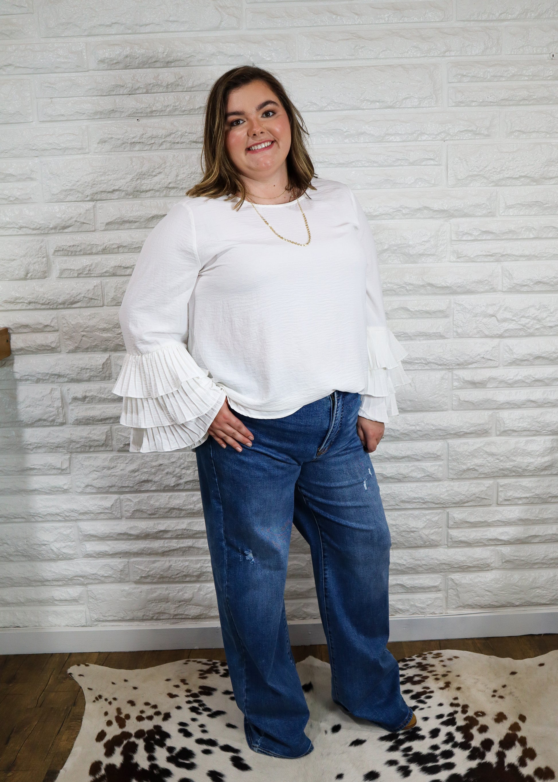 This ivory top is a timeless addition to any wardrobe. Crafted with soft-touch fabric, it features a classic round neck, long sleeves, and pleat-tiered edges for an extra special feel. Effortless and elegant, it will take you from day to night in style.