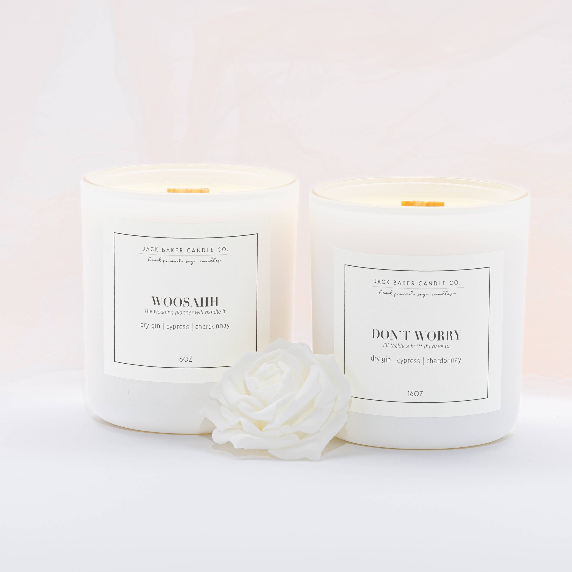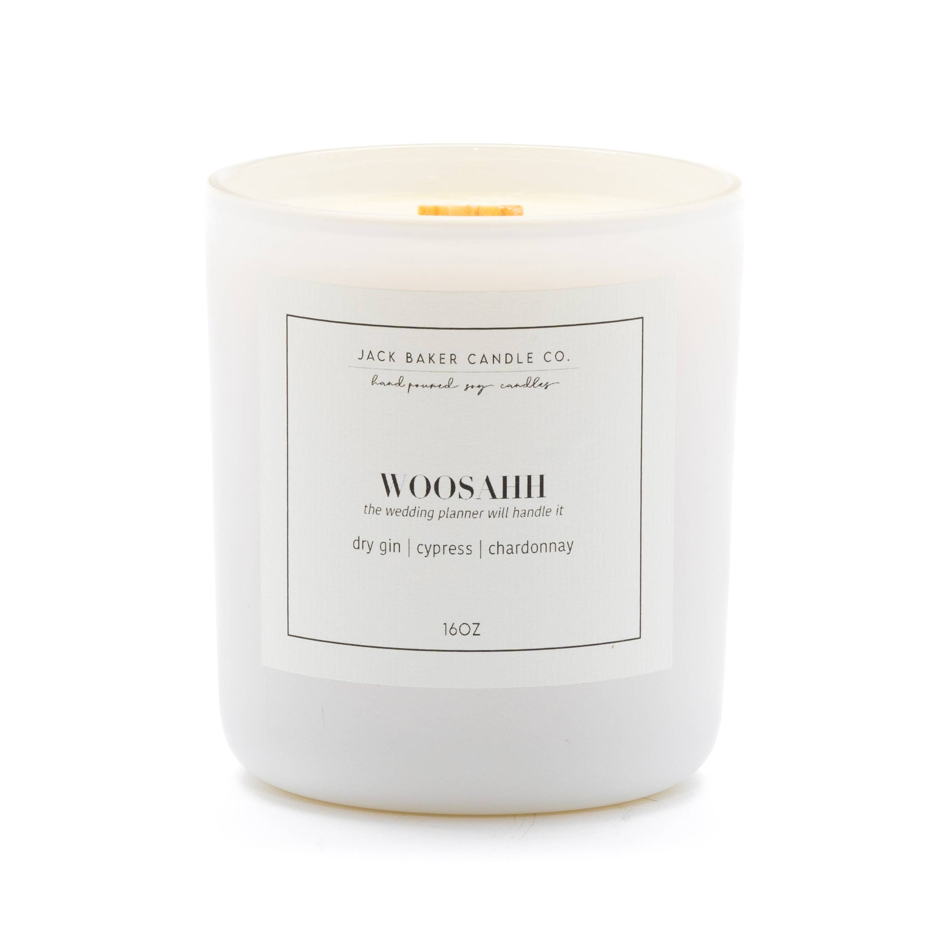 This candle has a white linen painted finish and is adorned with a premium wooden wick.